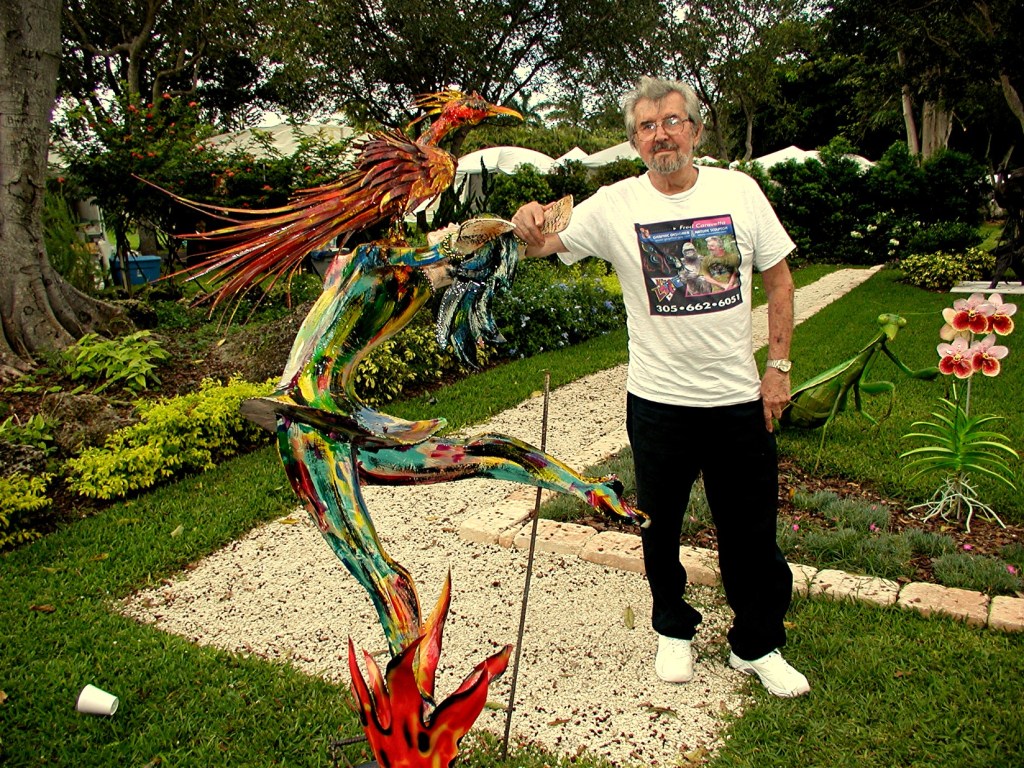 His passion for his new expression of artistry showed in his work. Using a laser-like cutter, a helitorch and a hammer to shape pieces of steel, then applying paint to the surfaces, he created animals, birds of prey and giant insects that were amazingly real in appearance. One was a praying mantis, another a Monarch butterfly that was on display in the lobby of the Coral Gables Public Library for years, both were many times life size and startlingly realistic..