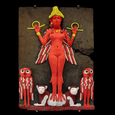 There is a vase at the Louvre with another depiction of Ishtar. On the vase are drawings of birds and fish. Ishtar is shown on it with similar birdlike feet but there they are not as finely rendered.